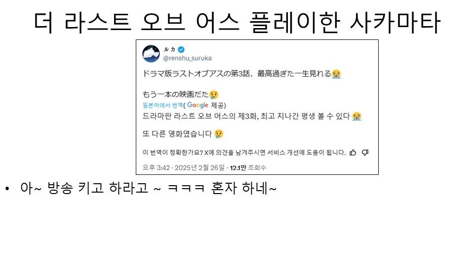 홈루카 사카마타 쿠로에 근황 소식 - 루카로 개인세 활동 하는 사카마타 언제 버튜버 데뷔 할까? by조선누룽지 •2월 27, 2025 • 2 min read 0 Tags: 루카 버튜버 사카마타 쿠로에 일본 버튜버 홀로라이브 4.94 / 169 rates Facebook Tweet 복사Link Copied 공유